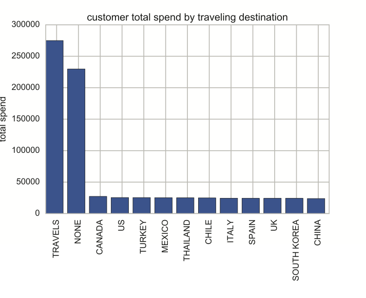 Then again, the team may hit a dead end. A data visualization created to analyze spending patterns among customers who travel and those who don't is inconclusive, as shown below. It reveals only that customers who travel outspend, by a relatively small margin, those who don't travel and that customers who do travel visit a variety of destinations around the world and the total spend by customers who travel to those destinations is no greater than the total spend by customers who don't travel. The data visualization doesn't provide sufficient evidence to support a change in what the company is doing, so the team abandons this line of enquiry and shifts direction.