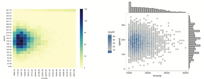 For example, the data visualizations may be graphs that shed light on customer income and spend, as shown here. The x-axis (horizontal) represents income, and the y-axis (vertical) represents spending. Note that customers with higher incomes don’t necessarily spend more. Those who have an income around $20k–$30k seem to spend the most.