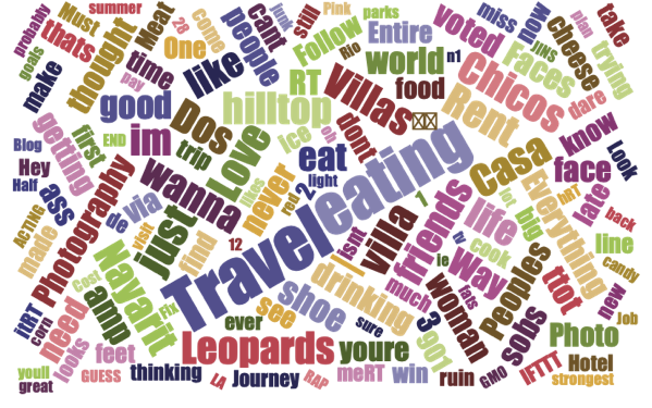 The analysts could also look at data from social media platforms and create a word cloud of feedback from thousands of customers, as shown below. For example, some of the largest words in the word cloud are “travel,” “recipe,” and “restaurant.”