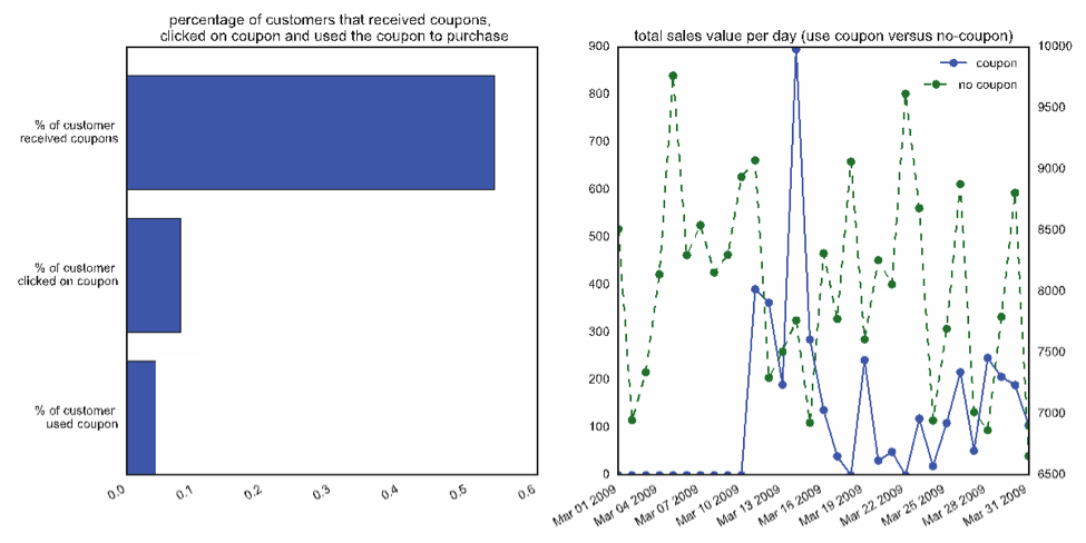 The graph on the left shows that more than half the customers received coupons, only about eight percent clicked on the coupon, and only about half of those people used the coupon.