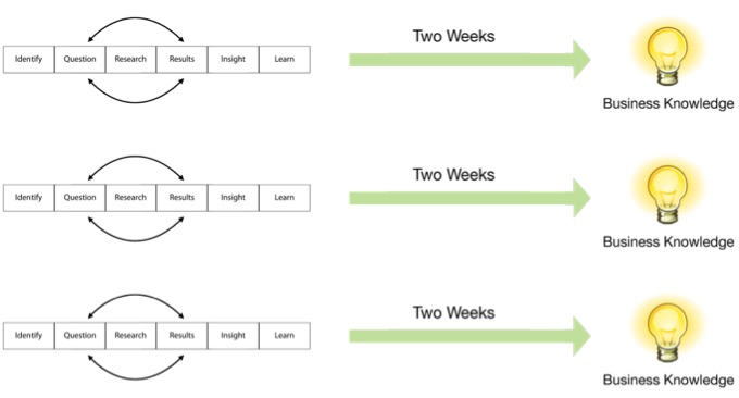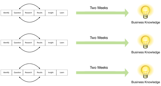 The DSLC isn’t designed to cycle over a long period of time. Two weeks is sufficient for a cycle (a sprint). That gives the team sufficient time to prepare and analyze the data and compose a story that reveals the knowledge and insight extracted from the data and its significance to the organization during a 3 week sprint. With short cycles, if a specific line of enquiry proves fruitless, the team can change course and head in a different direction or tackle a new challenge.